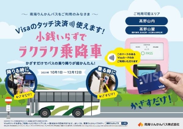 南海電気鉄道株式会社(本社:大阪府大阪市、代表取締役社長:遠北 光彦)、南海りんかんバス株式会社(本社:和歌山県橋本市、代表取締役社長:大森 幸宏)、三井住友カード株式会社(本社:東京都江東区、代表取締役社長:大西 幸彦)、QUADRAC株式会社(本社:東京都港区、代表取締役社長:高田 昌幸)、ビザ・ワールドワイド・ジャパン株式会社(本社:東京都千代田区、代表取締役社長:スティーブン・カーピン)、株式会社小田原機器(本社:神奈川県小田原市、代表取締役: 丸山 明義)は、2021年10月1日(金)から12月12日(日)まで、高野山内・山麓の路線バスにおいてVisaのタッチ決済による実証実験を実施します。バスの乗車口と降車口にVisaのタッチ決済の専用読取端末機を設置し、乗車・降車時にVisaのタッチ決済でタッチしていただくことで、乗車区間に基づいた運賃をお支払いただけます。