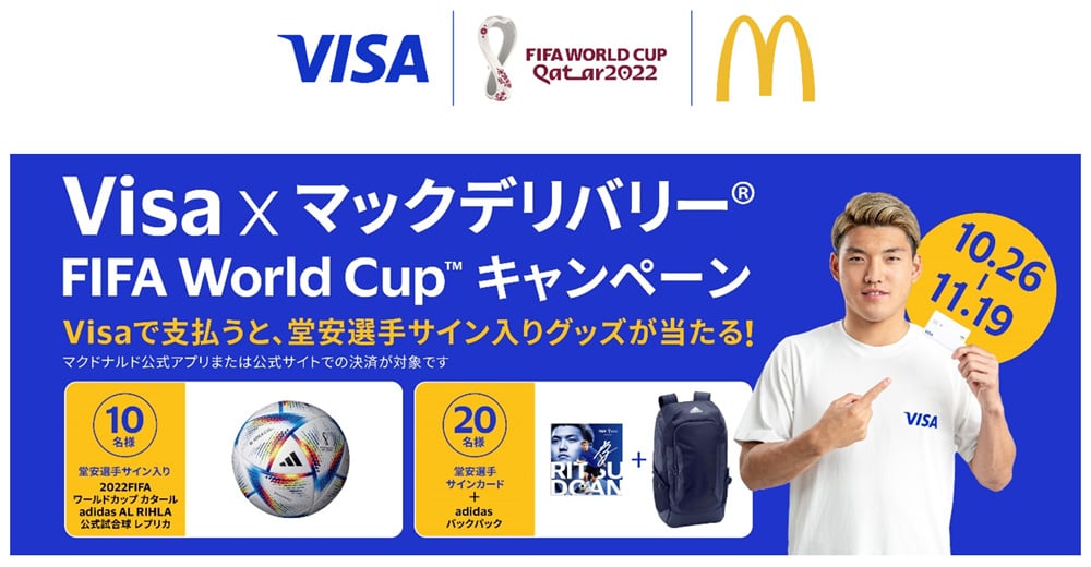 ビザ・ワールドワイド・ジャパン株式会社(東京都千代田区、代表取締役社長:スティーブン・カーピン、以下、Visa)は、10月26日(水)から11月19日(土)までの期間、「Visa xマックデリバリー® 2022FIFAワールドカップ カタールキャンペーン」を実施することを発表いたします。抽選で合計30名様に堂安選手のサイン入りグッズが当たります。 Visaは2007年から、FIFAが全世界で開催する大会での公式決済サービスパートナーを務めています。 このスポンサーシップのもと、今回のキャンペーンなど様々な活動を通じて、より多くの方と共に、選手への応援で、「2022FIFAワールドカップ カタール」を、一緒に盛り上げていくことを考えています。