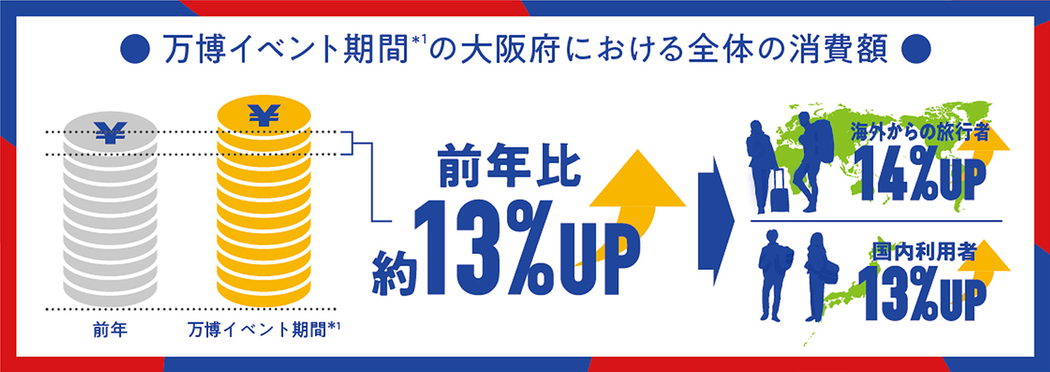 万博開催期間中、大阪府の消費全体において、前年比で約13%増加*1し、国内利用者による消費は13%*1の増加、海外からの旅行者*2による消費は14%*1の増加が見られました。