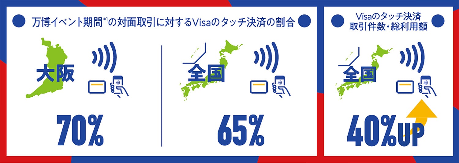 万博開催地・大阪では、対面取引件数の約70%がタッチ決済となり*6、全国平均(65%*6)を上回る結果となりました。また、タッチ決済による消費額を見ると、前年比で、京都では50%*1、兵庫でも55%*1と大幅に増加したことがわかりました。タッチ決済による取引件数および消費額において、全国平均の40%*1の増加を上回る結果となっています。