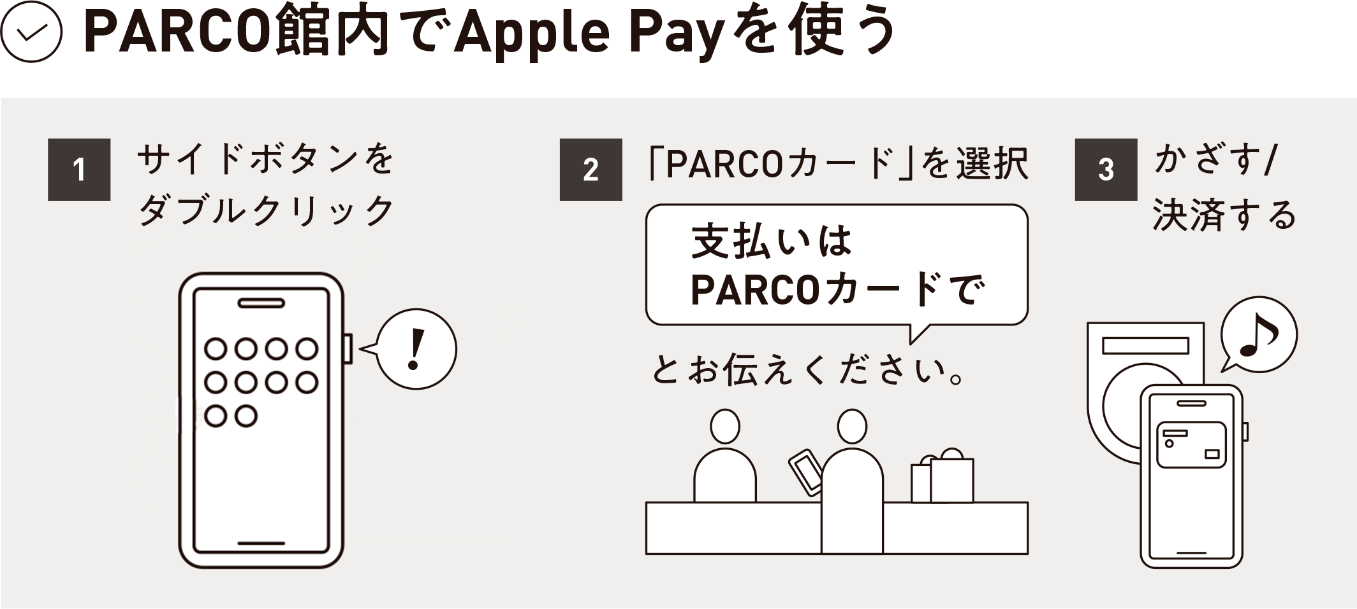 *1:静岡PARCO・福岡PARCOではApple Pay(を使ったVisaのタッチ決済)はご利用いただけません。