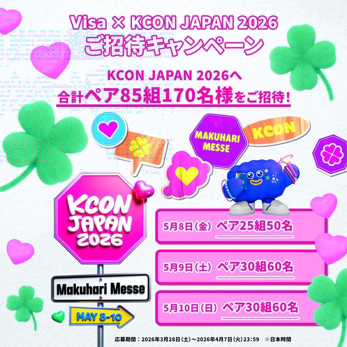 Visa公式Instagram(https://www.instagram.com/visajp_official/)をフォローのうえ、該当投稿へのコメントおよび「いいね」を行った方の中から、抽選で合計ペア85組170名様を「KCON JAPAN 2026」にご招待いたします。