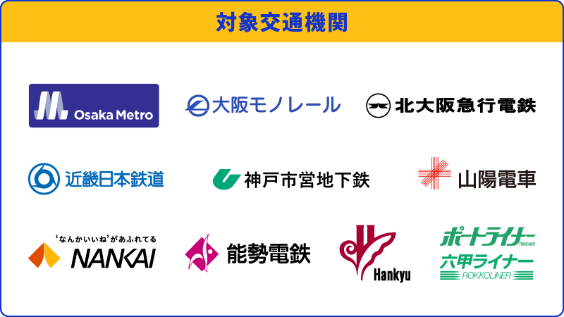 関西:Osaka Metro・大阪モノレール・北大阪急行電鉄・近畿日本鉄道※1・神戸市交通局・神戸新交通・山陽電鉄※2・南海電気鉄道※1※3・能勢電鉄・阪急電鉄※2